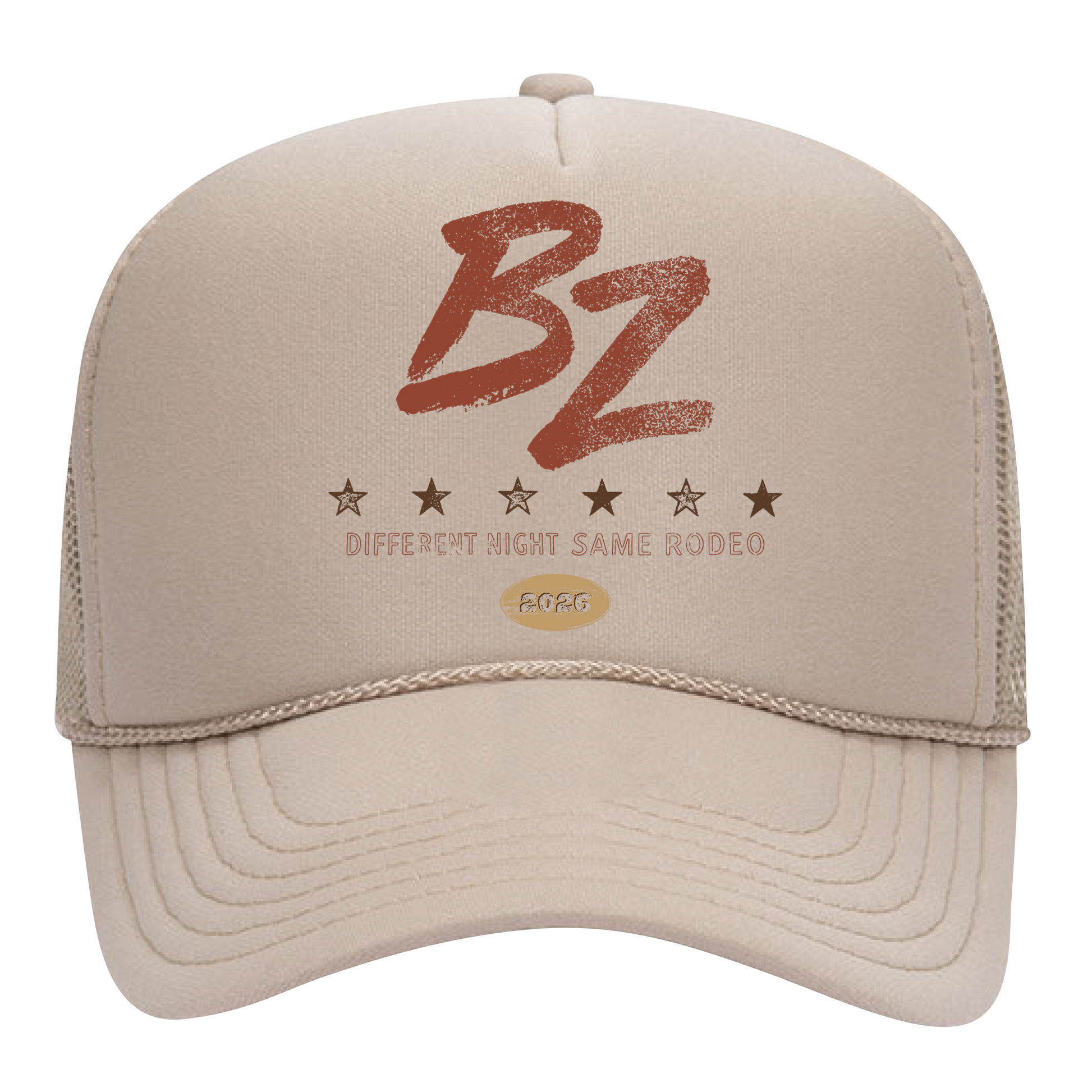 Khaki trucker hat with rope detail and snapback closure featuring "BZ // Different Night Same Rodeo // 2026" design on front.