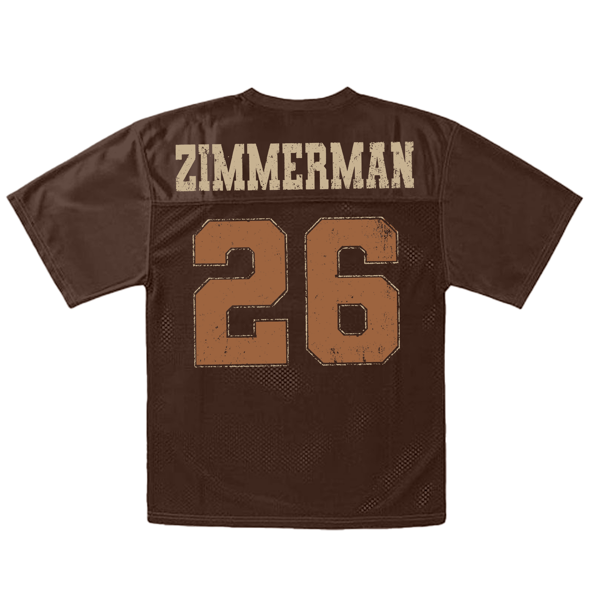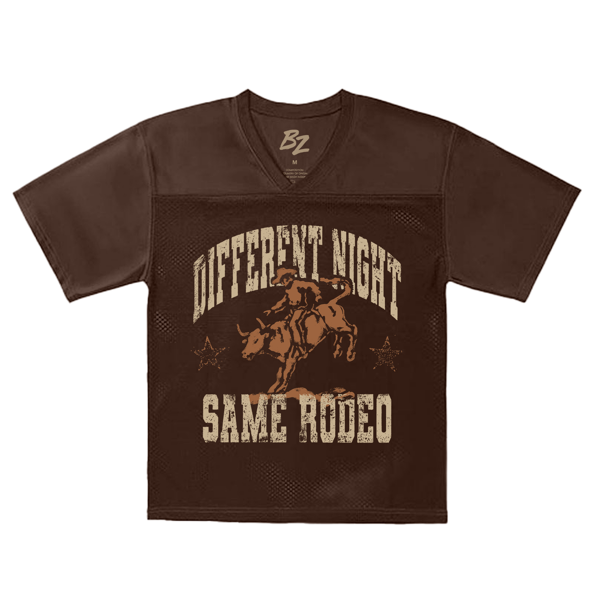 Custom brown jersey featuring a Different Night Same Rodeo bull riding graphic on front and "ZIMMERMAN // 26" on back.