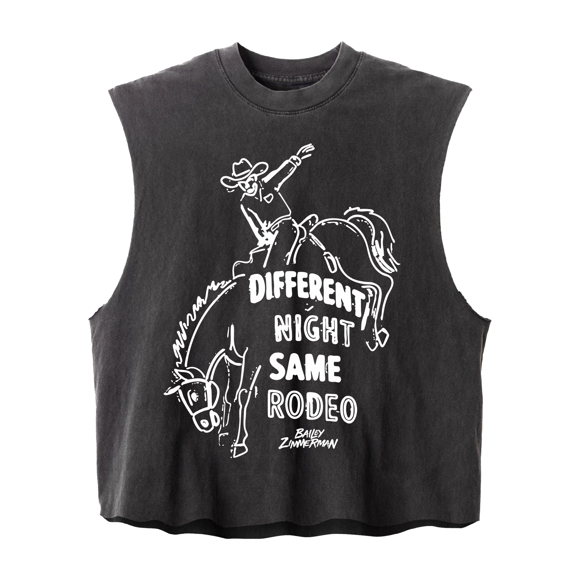 Unisex black muscle tank featuring the Different Night Same Rodeo graphic. Cropped fit. Due to the custom cropped finish, body length measurements may vary slightly.