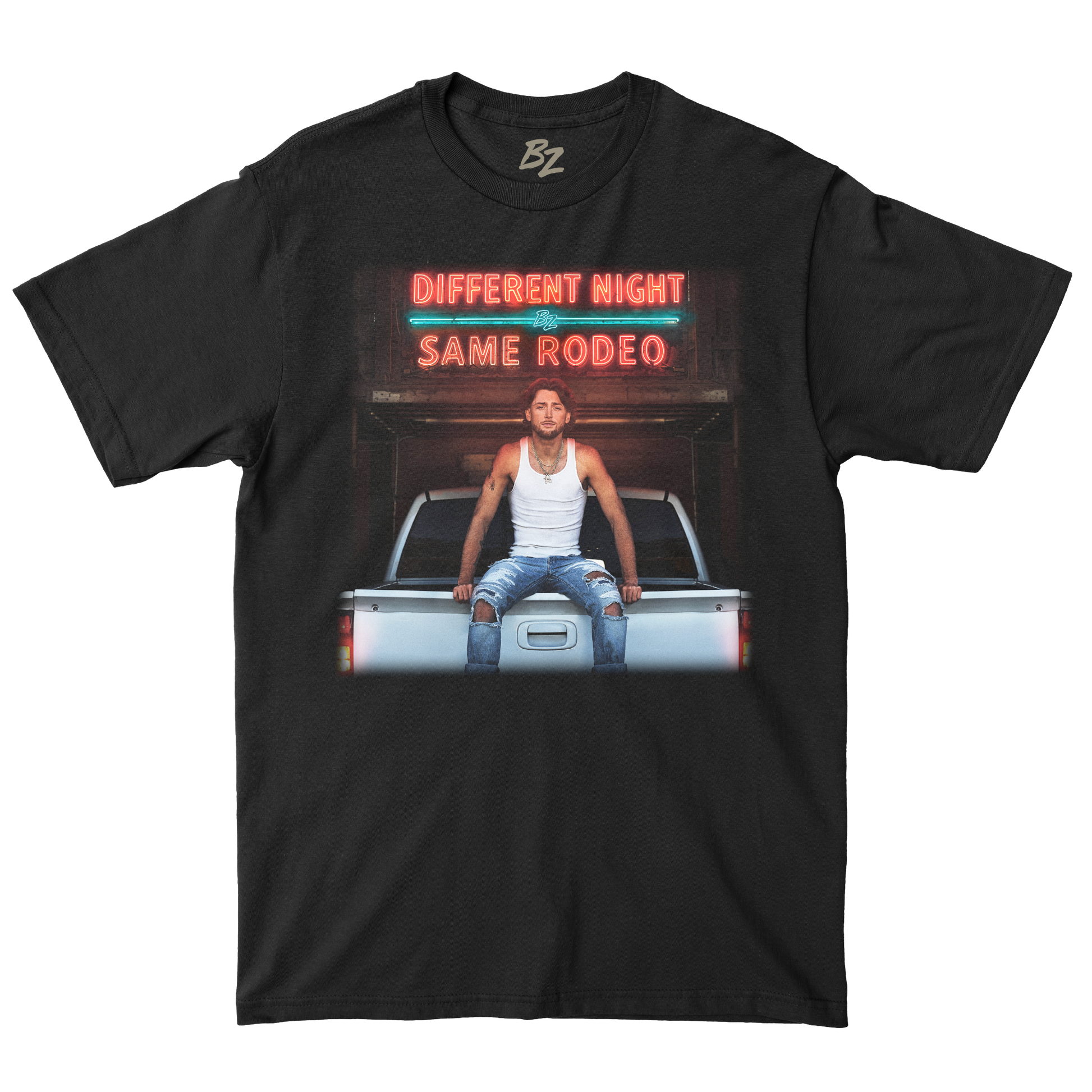 Unisex black tee featuring the Different Night Same Rodeo album cover on front and tracklist on back.